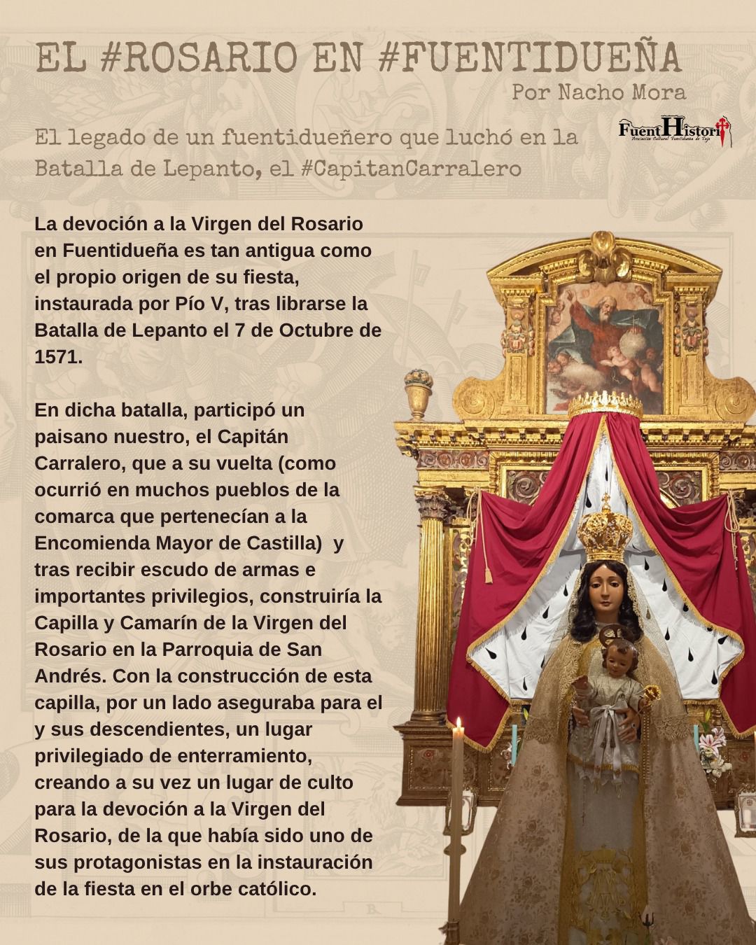Su origen se remonta a la Batalla de Lepanto (1571), cuando un fuentidueñero, el capitán Carralero, regresó con honores y levantó la capilla dedicada a la Virgen en la parroquia de San Andrés.